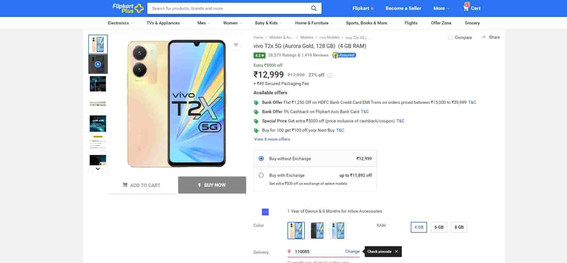 The Vivo T2x 5G smartphone is available to buy from Flipkart at 27% off Rs 12,999 from the retail price of Rs 17,999. This smartphone comes in an Aurora Gold color. This phone has a 4.5-star rating on Flipkart.