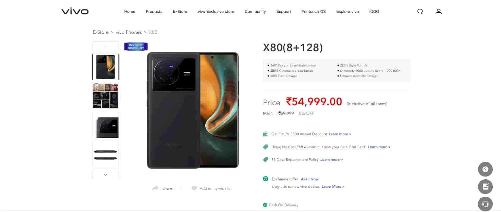 Vivo X80 was originally priced at Rs. 59,999 but it is now available on the Vivo website for Rs. 54,999 which means you can save Rs. 5000 on your purchase. You can also get an instant discount of Rs. 3500 on HDFC Credit & Debit card full swipe. The instant discount is valid only on E-store from 31st January 2023 to 28th February 2023.