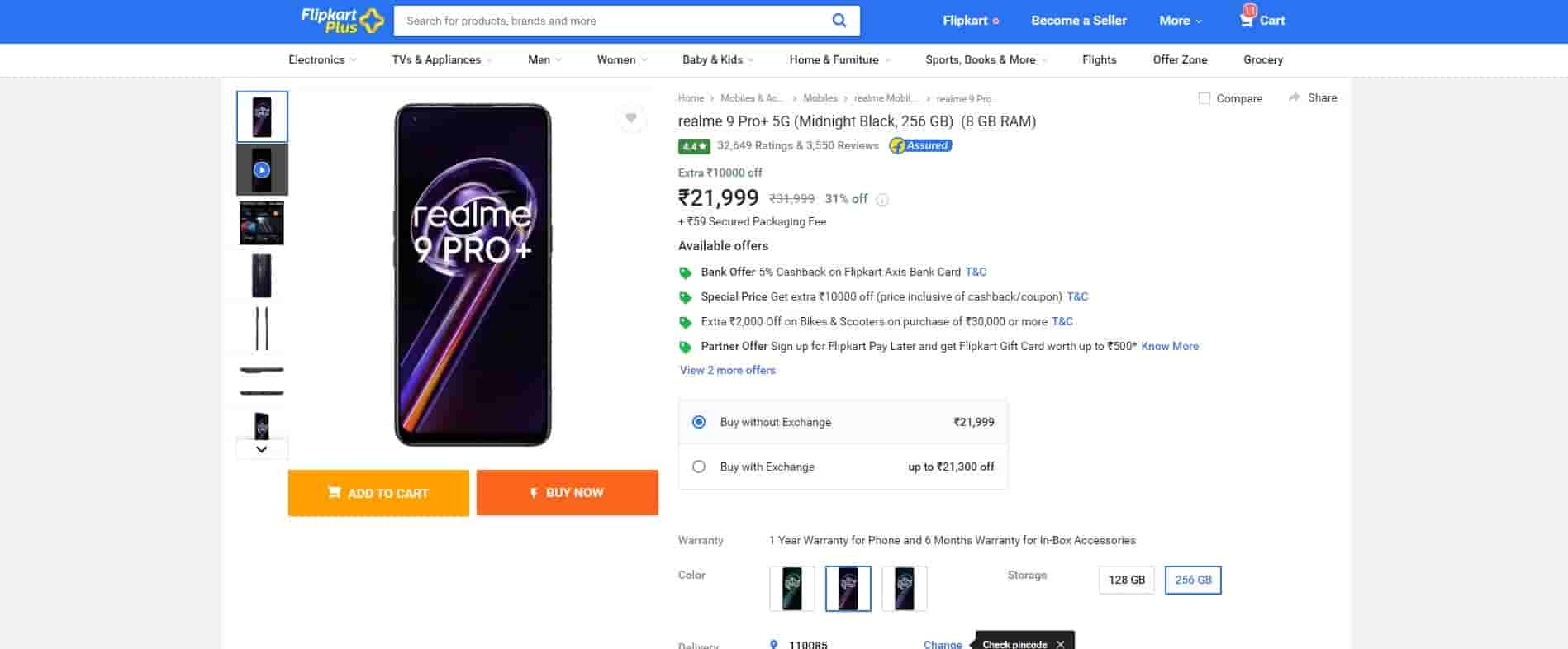 The Realme 9 Pro+ 5G smartphone is available to buy from Flipkart at 31% off of Rs 21,999 from the retail price of Rs 31,999. This smartphone comes in 3 colors; Midnight Black, Aurora Green, and Sunrise Blue.