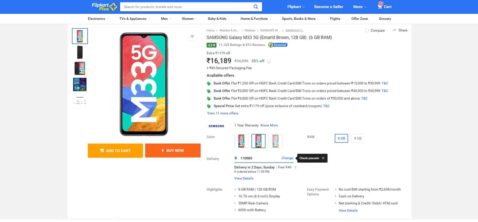 If you are looking for a smartphone that boasts a higher refresh rate display and comes with a large battery backup and large MP count camera at an affordable price this is for you. Samsung Galaxy M33 5G smartphone is available on Flipkart at 35% of massive discount. This discount has slashed the price from Rs 24,999 to Rs 16,189. Buyers can also grab it through the EMI option which starts from Rs 2,698 per month. You can get a flat Rs 1,250 off on HDFC Bank Credit Card EMI transactions.