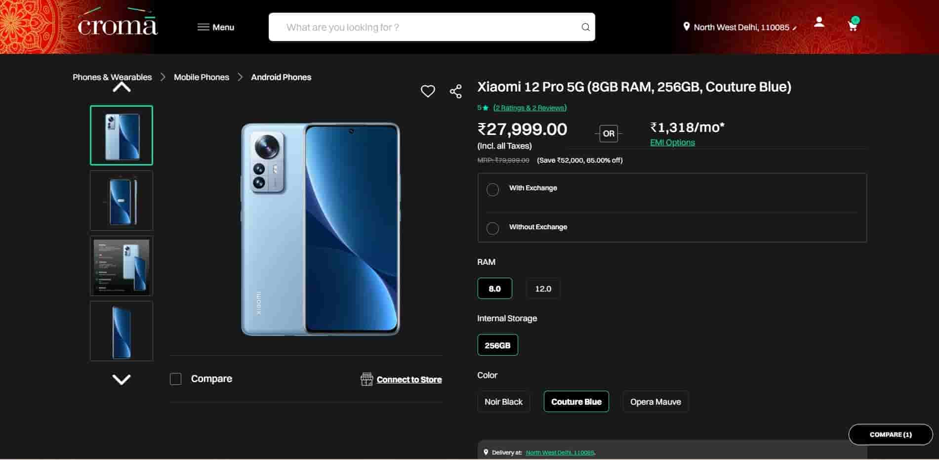 You can now buy the Xiaomi 12 Pro 5G smartphone from Croma with 65% off Rs 27,999 from the retail price of Rs 79,999 and save Rs 52,000 with this deal. This price is for the 8GB RAM variant. If you are interested in buying an upgraded variant with 12GB RAM, the price will be Rs 41,999 on Croma.