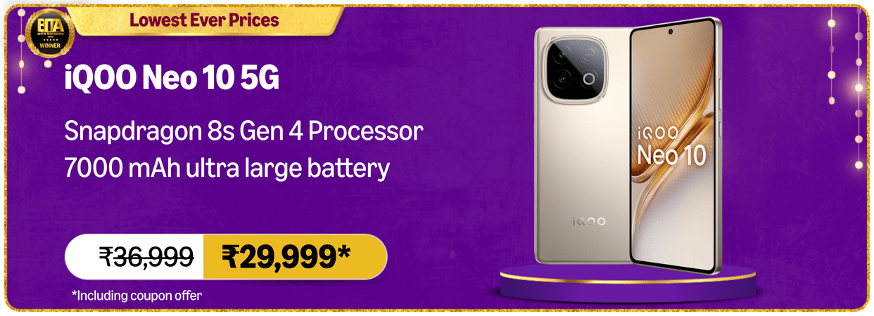 iQOO’s May 2025-released Neo 10 5G powered by the Snapdragon 8s Gen 4 chip and equipped with a 7000 mAh ultra large battery is available at INR 29,999 effective starting price with coupon offer (from its previous actual price of INR 36,999).