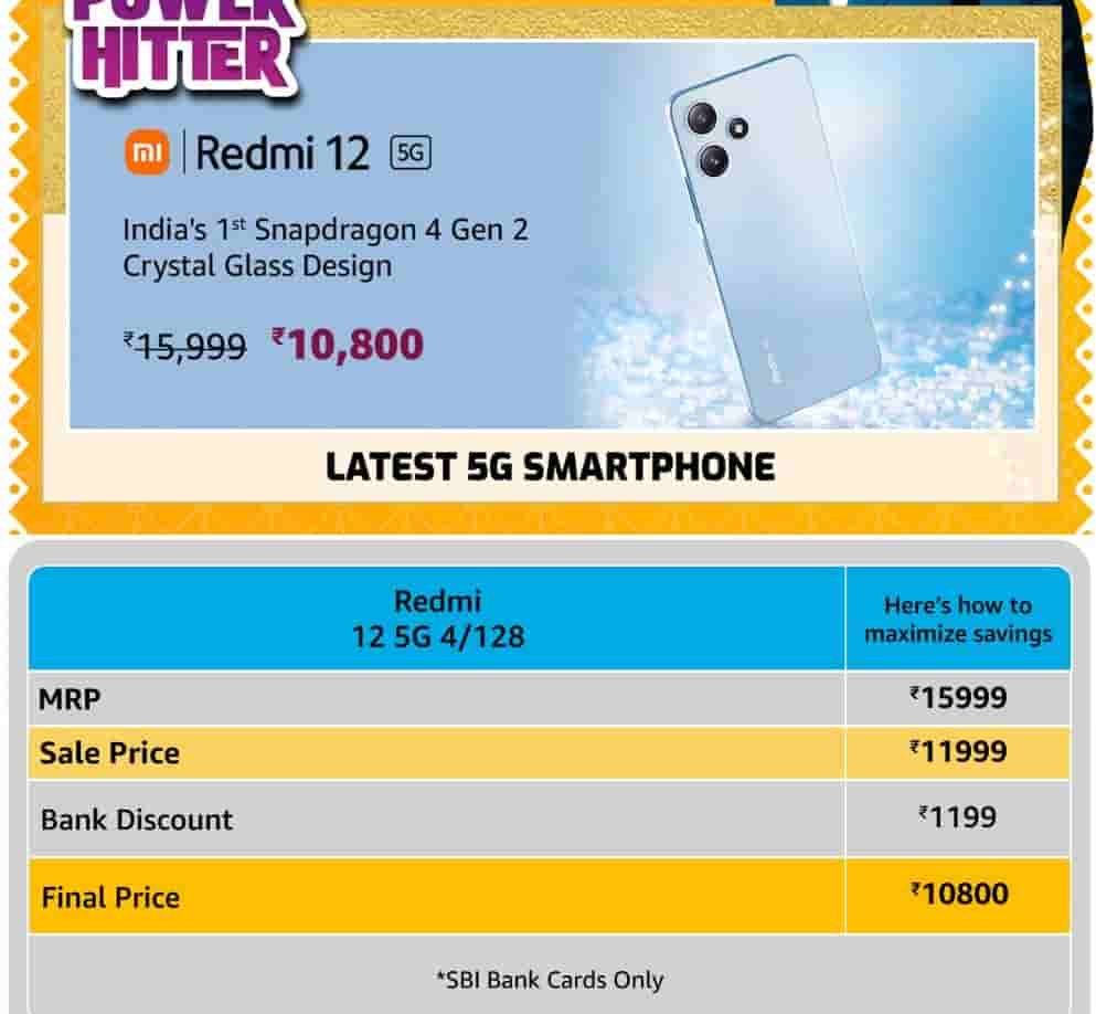 The original price of the Redmi 12 5G 4GB/128GB variant is Rs.15,999 but in the upcoming sale, the device will be available for Rs.11,999. Amazon is offering a Rs.1,199 bank discount (SBI Bank Cards only) on the purchase of this device which brings down the price of the Redmi 12 5G smartphone to Rs.10,800.