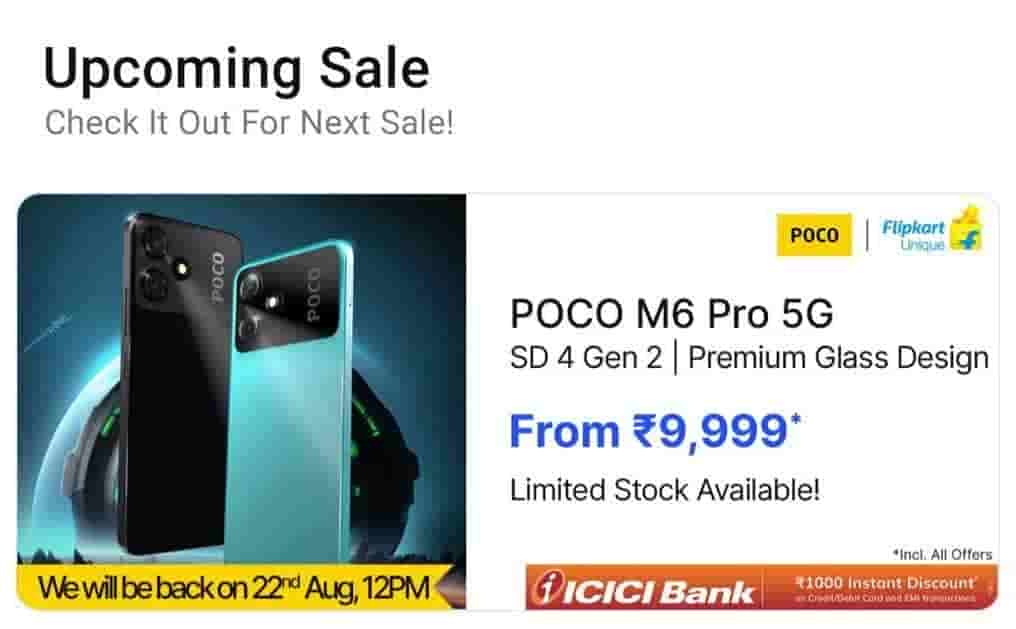 The Poco M6 Pro Smartphone’s sale is about to start again on August 22, 2023, at 12PM. This smartphone is priced at Rs 10,999 which is 26% off from the retail price of Rs 14,999. You can get this smartphone at a price of Rs 9,999 with a Rs 1,000 instant discount on the ICICI Credit Card and Debit Card on orders above Rs 5,000.