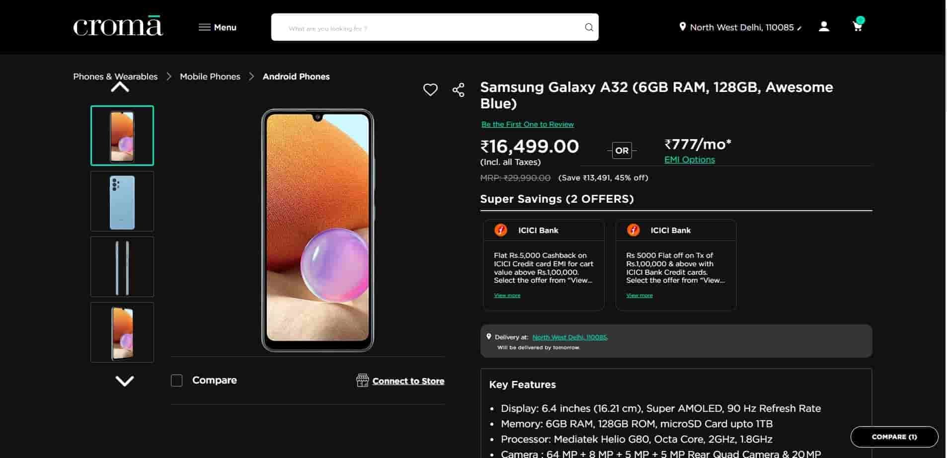 Samsung Galaxy A32 with 6GB RAM and 128GB internal storage available on Croma for just Rs 16,499
