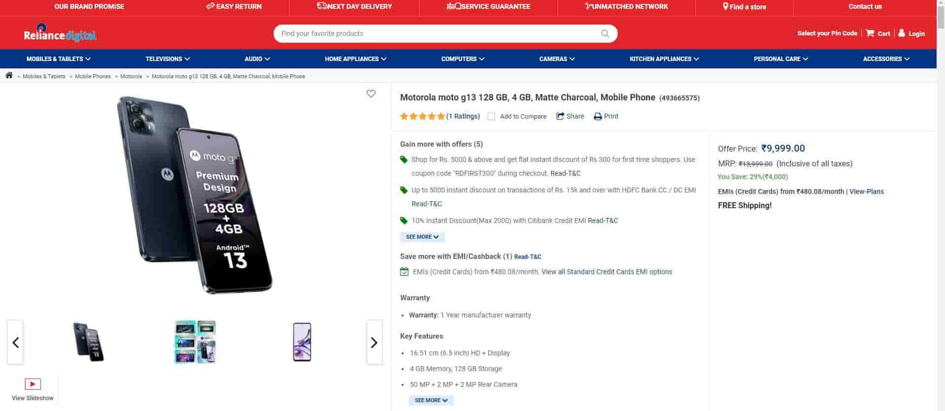 The Motorola Moto G13 smartphone is available on the Reliance Digital website at 29% off of Rs 9,999 from the retail price of Rs 13,999. This smartphone comes in a Matte Charcoal finish.