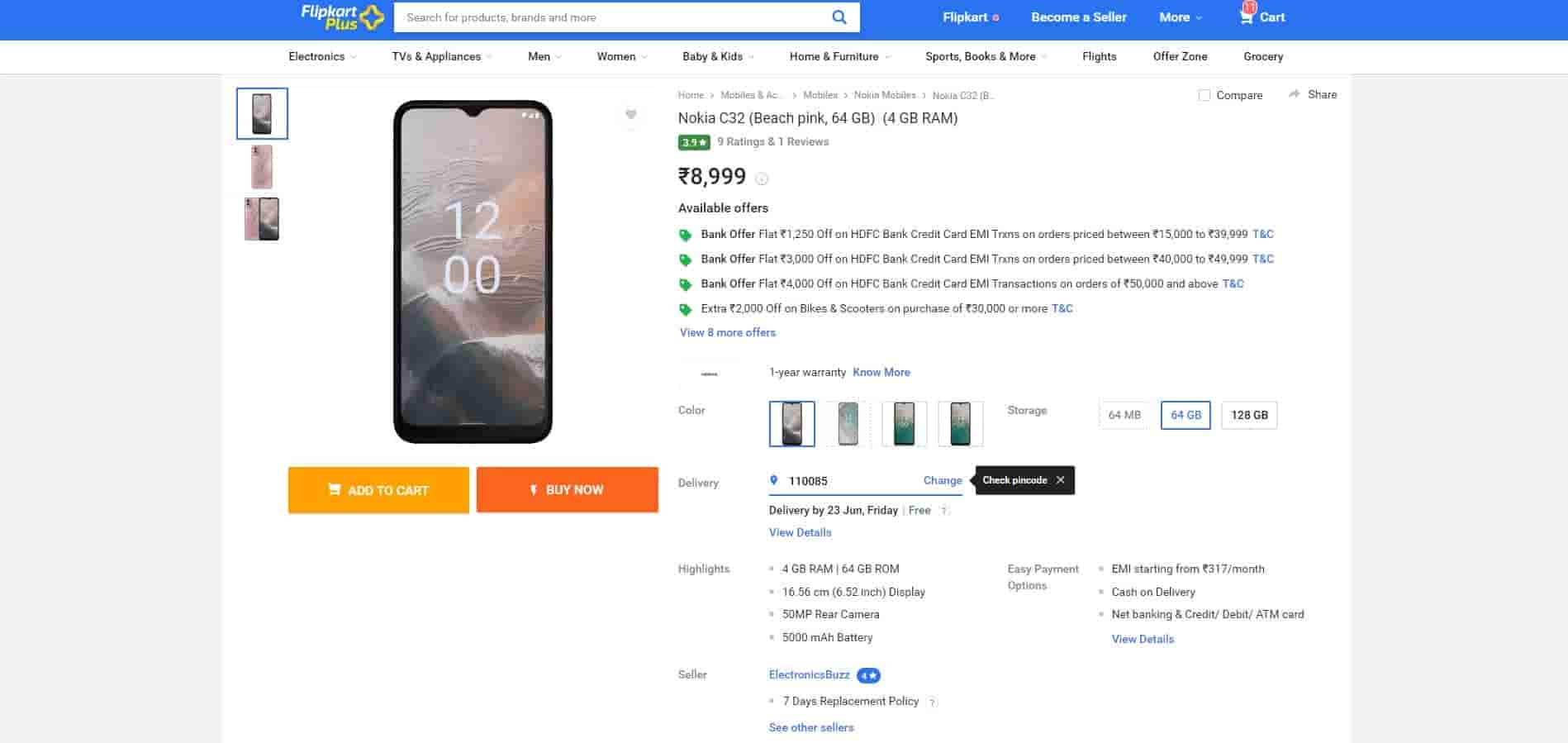 The Nokia C32 smartphone is available to buy from Flipkart for the best price of Rs 8,999. This smartphone comes in 3 colors; Mint, Charcoal, and Beach Pink.