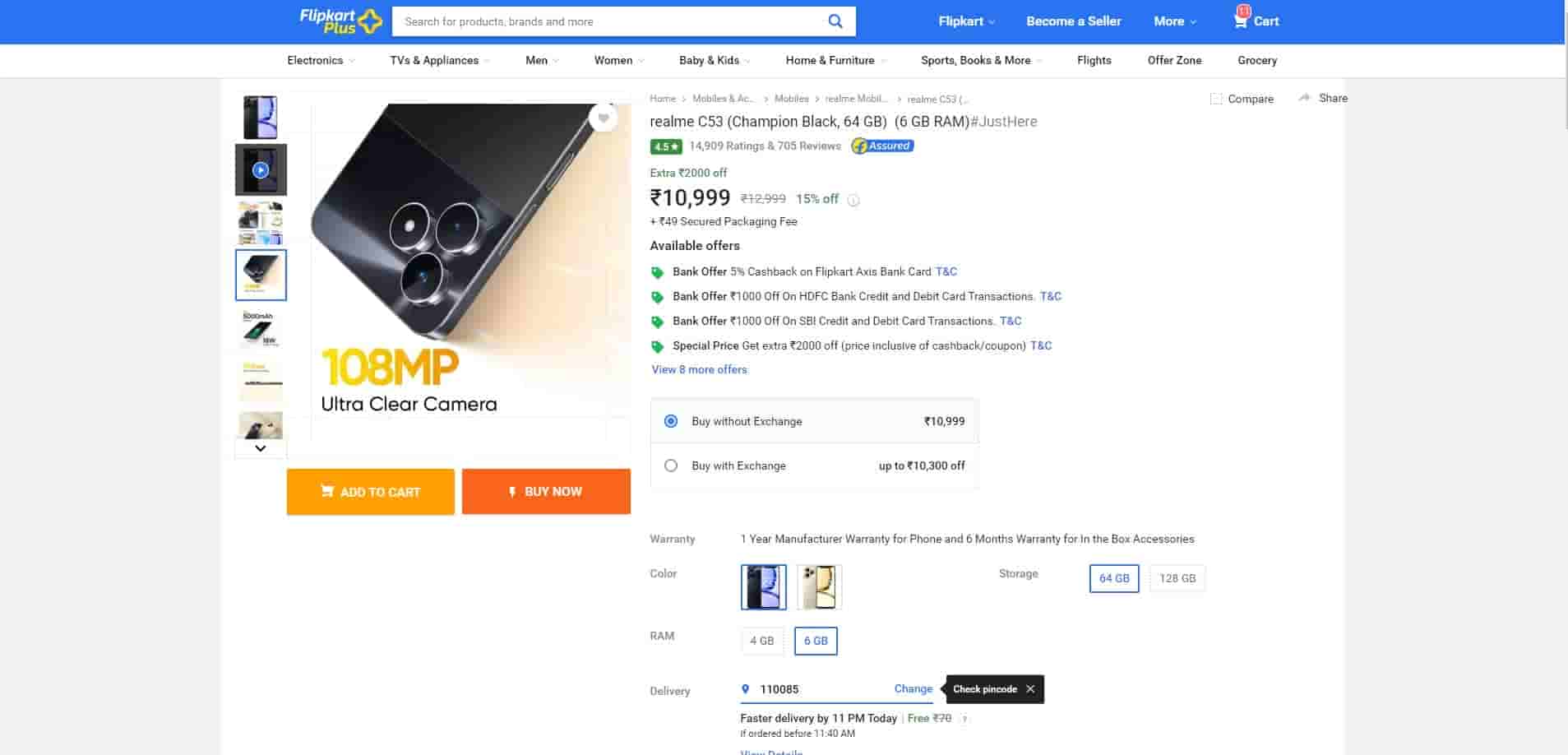 The Realme C53 smartphone is available to buy from Flipkart at Rs 10,999, which is 15% off Rs 12,999. This smartphone has a 4.5-star rating on Flipkart.