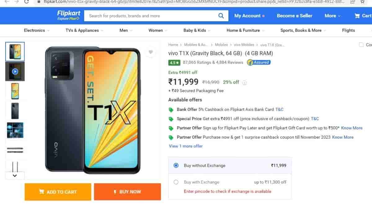 Vivo T1x was originally available for Rs. 16,990 but now on Flipkart, the price has been cut down by Rs.4,991. This means you can now get this device just for Rs.11,999. Along with this whooping 29% discount, consumers can also benefit of a few offers :