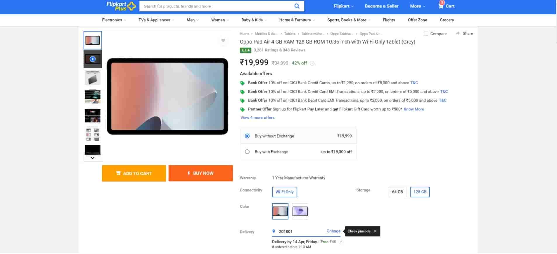 The Oppo Pad Air is available to buy on Flip at 42% off of Rs 19,999 from a retail price of Rs 34,999. The product comes in a grey color and a purple color. The product is given a 4.5-star rating on Flipkart.
