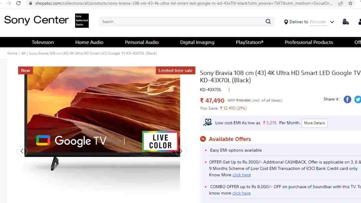 Sony Bravia 108 cm 4K Ultra HD Smart LED Google TV available for 21% discount at Sony Center official website