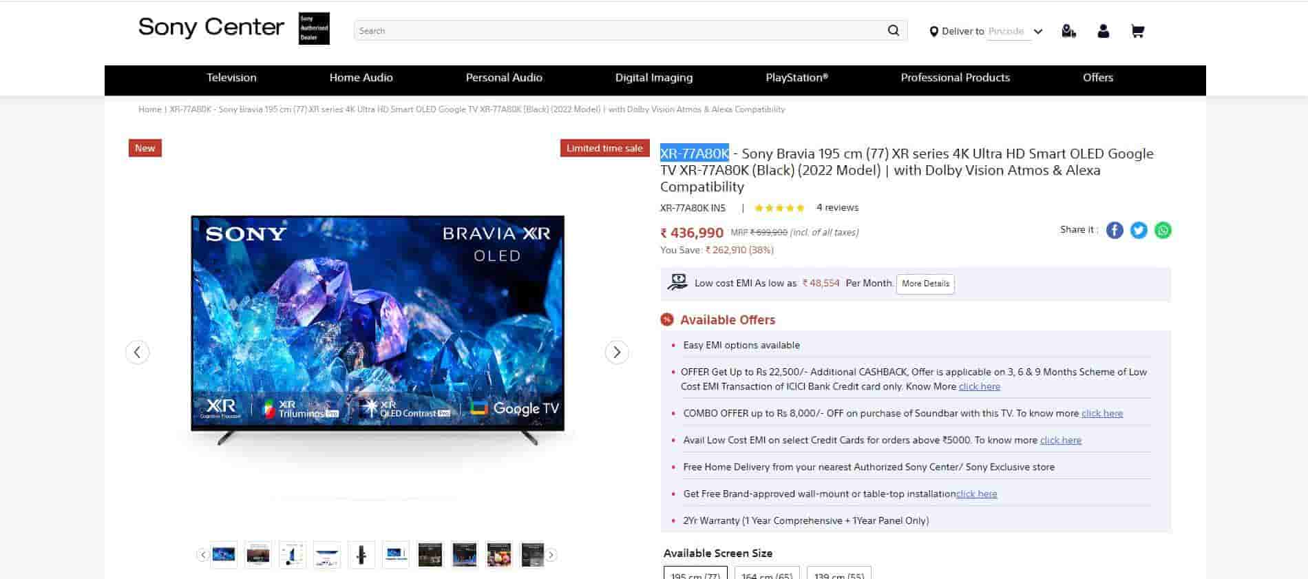 Sony Bravia XR-77A80K 4K Ultra HD Smart OLED TV (2022) is available to buy at Sony Center at Rs 4,36,990 which is 38% off its retail price of Rs 6,99,900.