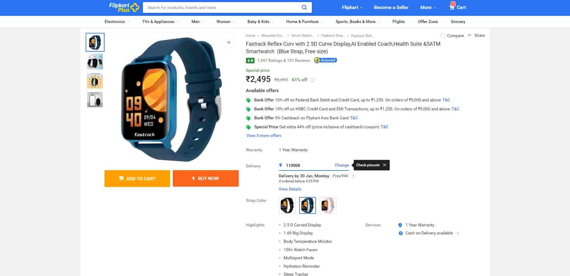 Fastrack Reflex Curv Smartwatch was originally priced at Rs. 6,495 but now you can get it for Rs. 2,495 only on Flipkart. This means you can save Rs. 4000 on this deal. Also, you can avail many offers along with this deal-