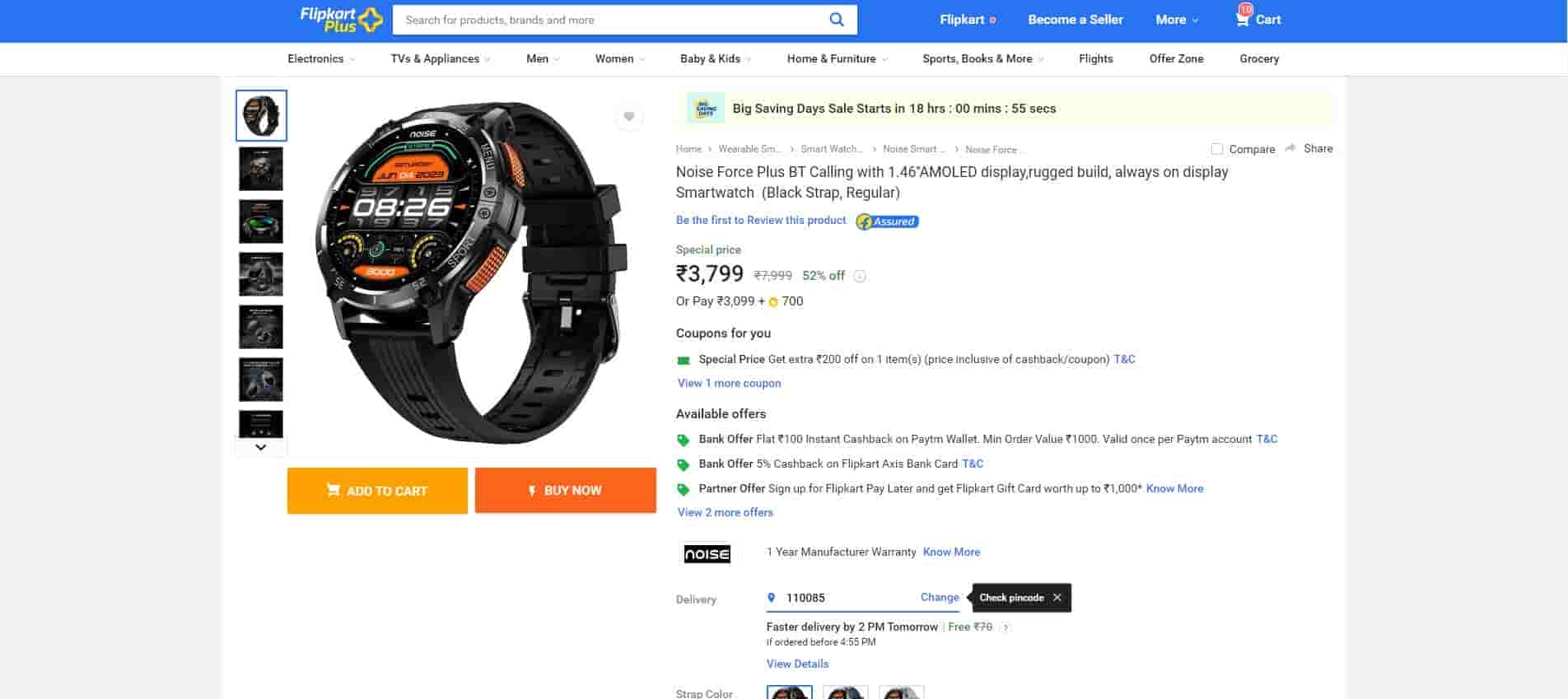 Noise Force Plus BT-calling Smartwatch is available to buy from Flipkart at Rs 3,799, which is 52% off the retail price of Rs 7,999. This Noise smartwatch comes in 3 color variants; Black, Blue, and Grey.