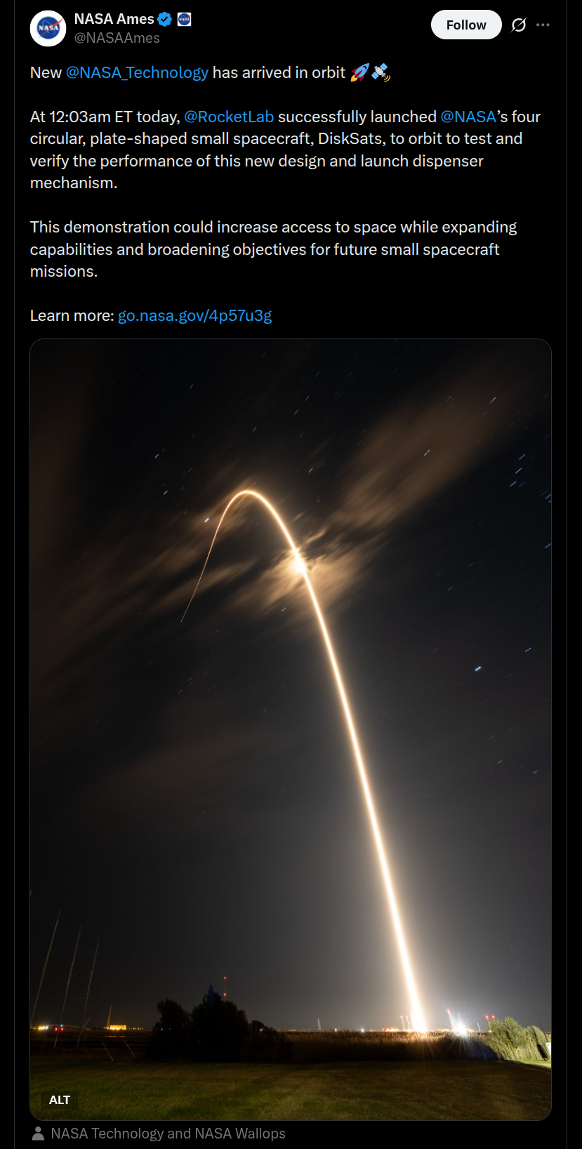 On the 18th of December 2025, at 12:03 AM EST, the new DiskSat spacecraft (set of four) from NASA was launched, and a Rocket Lab Electron rocket was relied on for this mission. The take-off took place at the Launch Complex 2 located on Wallops Island, Virginia. The launch was successful, and the four plate-shaped circular small spacecraft set has reached the Low Earth Orbit (LEO). This ongoing mission aims to test the performance of the new small spacecraft design over the conventional CubeSat design, thereby further contributing towards conducting lower-cost space missions in the future, broaden the scope for scientific opportunities, and also increase the overall space access. In addition to the DiskSat performance, the specialized dispenser mechanism will also be tested and evaluated.