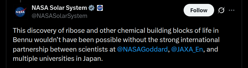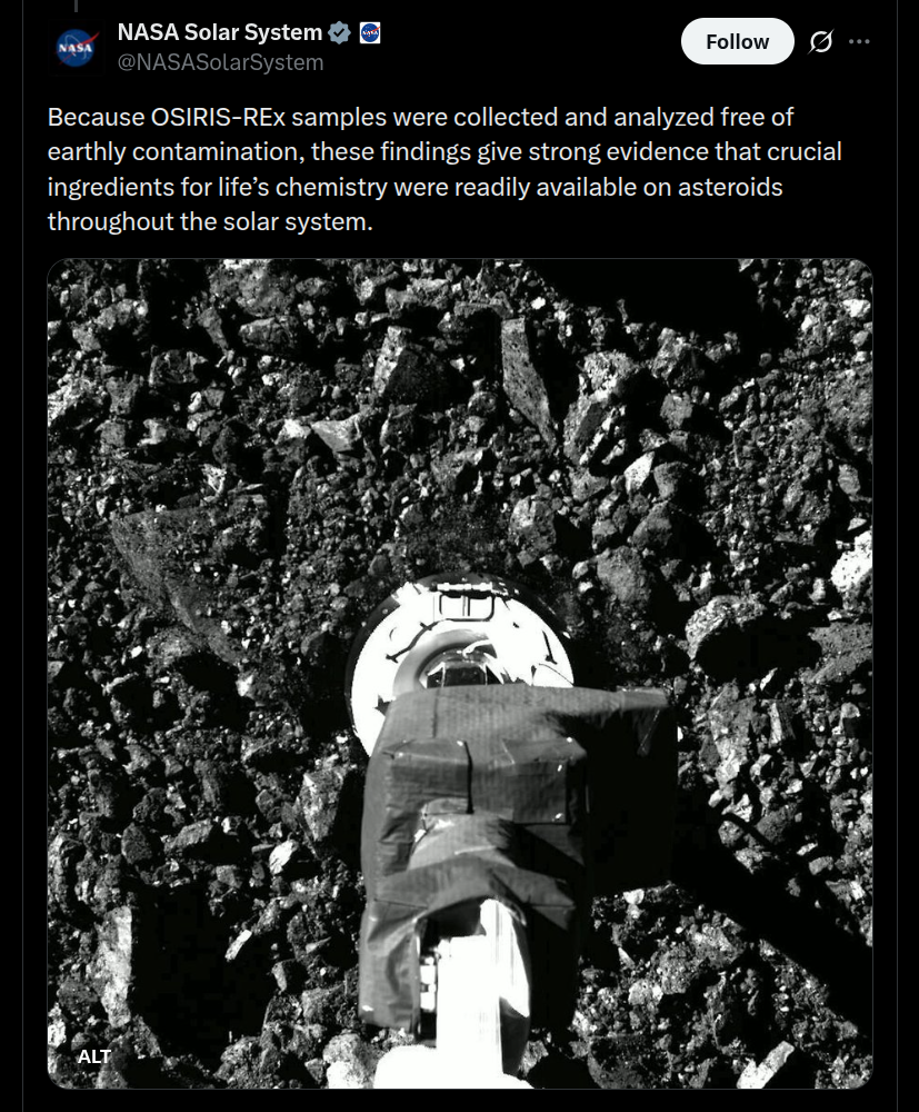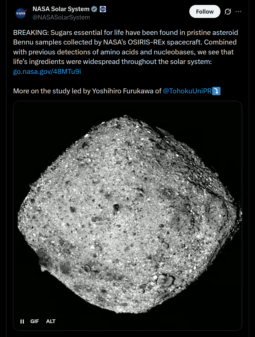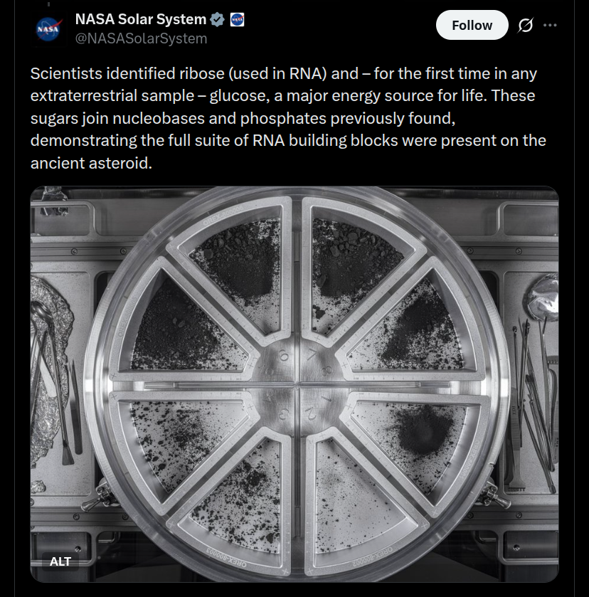 Presence of Sugars Essential for Life Found in Asteroid Bennu Samples Collected by NASA’s OSIRIS-REx Spacecraft