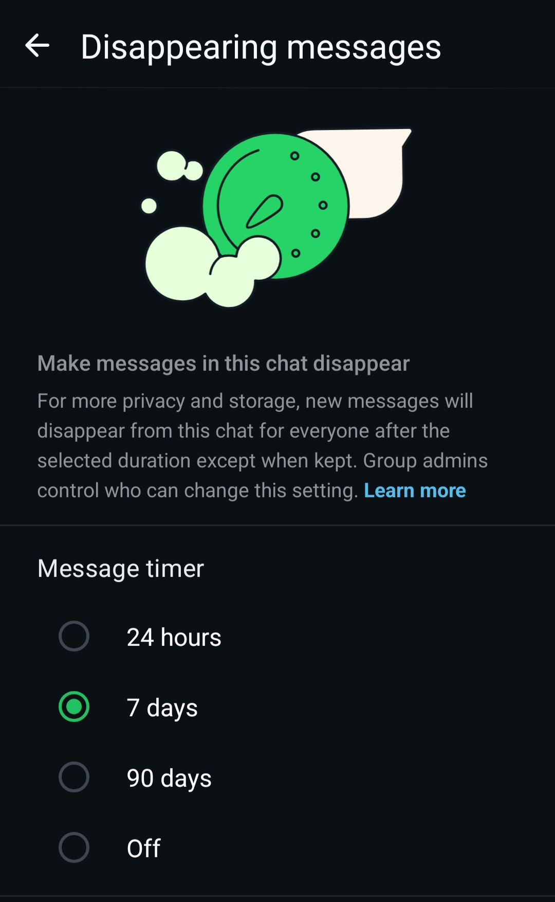 You can now set the message timer for 24 hours/ 7 days/ 90 days, and new messages will auto-delete after that time.