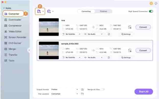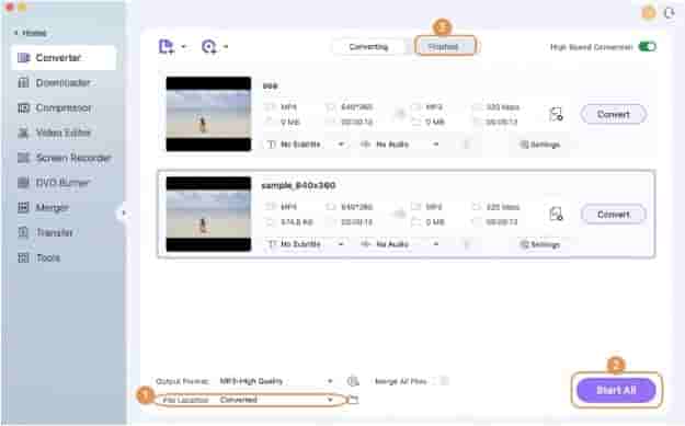 Next, pick an output folder in the File Location box at the bottom by clicking Convert to the right of the imported media. In the top-right corner, make sure the High-Speed Conversion option is selected. The word Success shows underneath the Convert button after the conversion is finished. To see the converted video, choose the “Finished” tab.