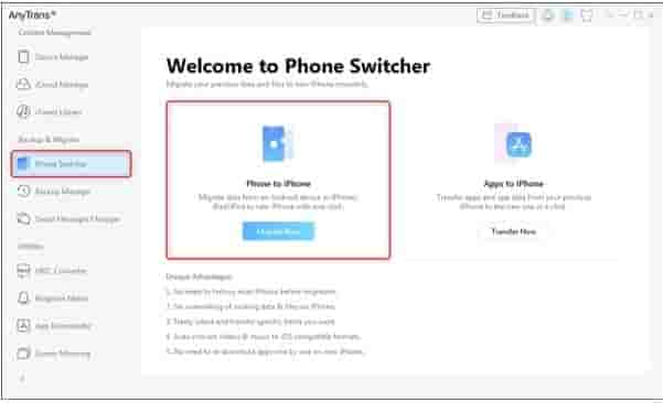 Let’s have a look at how AnyTrans’s “Phone Switcher” feature can help with transferring data from an Android device to iPhone: