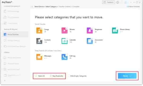 Step 3: To transfer files from your Android device to your iPhone, click the Next button. By default, every file that may be verified will be done so. After unchecking the box next to Select All, you can choose the individual file categories you need.
