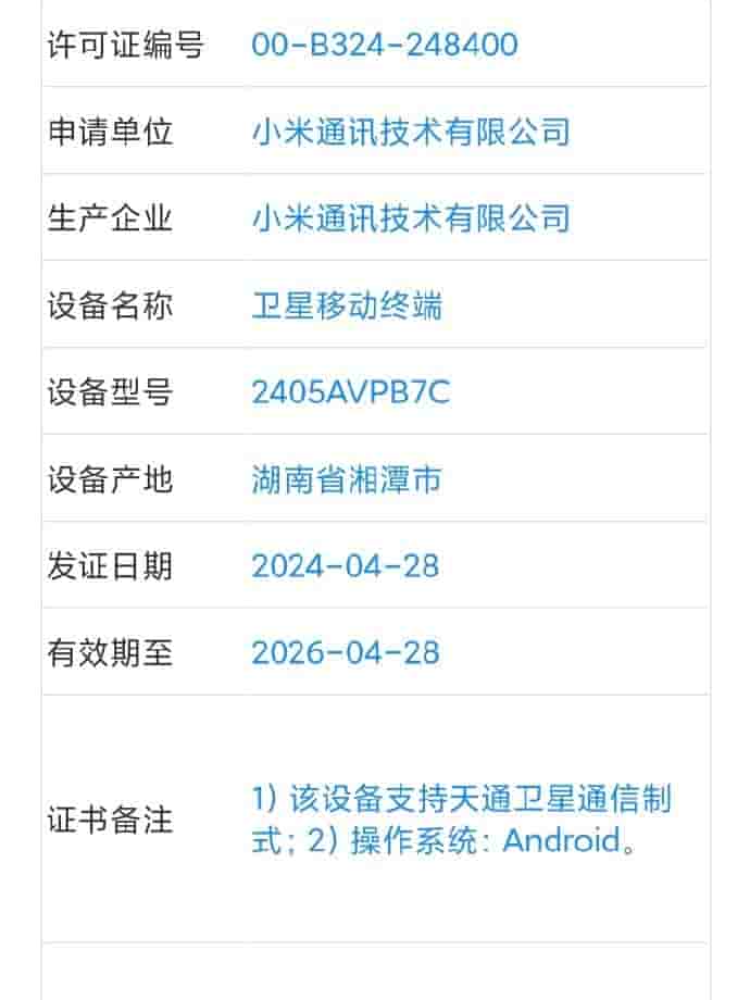A mysterious Xiaomi device with model number 2405AVPB7C has been spotted on MIIT certification website. The listing reveals that the device will be supporting Tiantong Satellite connectivity and will run on Android OS.