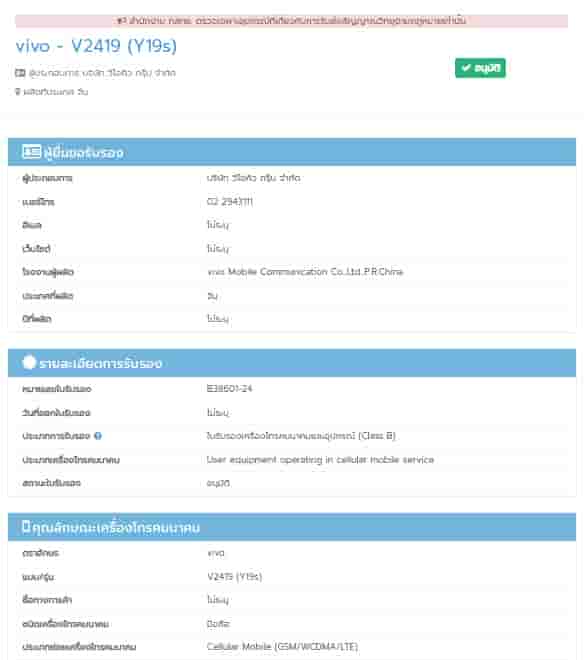 It has been spotted with the model number “V2419” and certifications from SDPPI, NBTC, and SIRIM reveal its moniker to be Y19s. Further, the NBTC certifications tell us it is a 4G smartphone.