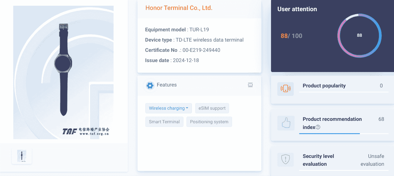 The Honor ‘TUR-L19’ watch has received the TENAA certification with the certificate number of ’00-E219-249440′ and is suggested to come with key specs such as satellite communication, eSIM, 480 mAh battery, and wireless charging capability. Moreover, Bluetooth, NFC, GPS, Beidou, and more are also supported on the device.