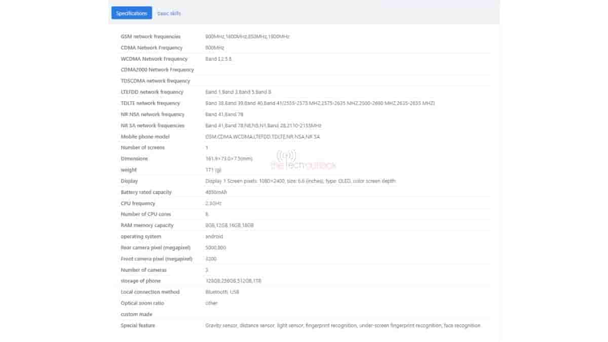 The device is revealed to arrive with a gravity sensor, distance sensor, light sensor, under-screen fingerprint recognition, and face recognition. It is also revealed to support GSM/WCDMA/LTE FDD/ TD LTE/ NSA/ NR/SA network connectivity. It will arrive with a built-in Antenna and dual SIM support.