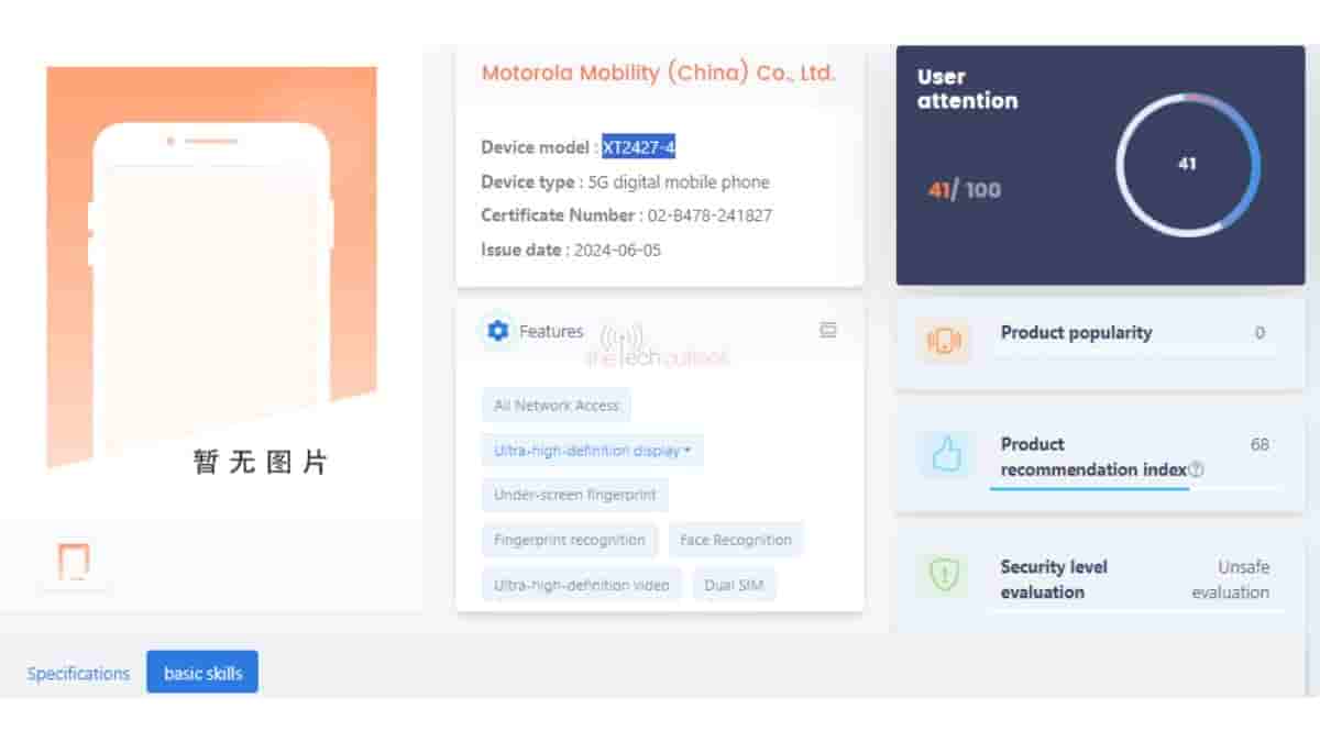 The Hi-Res Audio certification revealed that the smartphone arrived with model numbers XT2427-1, XT2427-2, XT2427-3, and XT2427-4. The Tech Outlook has today spotted model number XT2427-4 on the TENAA certification website.