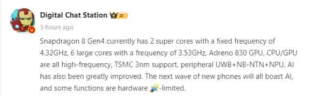 In a post on Weibo by tipster DCS, this new Snapdragon 8 Gen 4 is based on the TSMC 3nm support and will come with AI features.