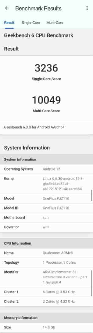 The OnePlus 13 has now been spotted on the Geekbench database with the model number ‘PJZ110’. The performance shown by this early prototype is impressive, achieving a single-core score of 3,236 and a multi-core score of 10,049. This is nearly double the performance of the OnePlus 12, which featured the Snapdragon 8 Gen 3 SoC.