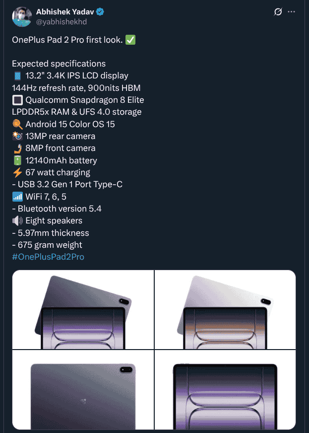 As per this new update (received via @yabhishekhd), the alleged OnePlus Pad 2 Pro device is suggested to arrive with key specs such as the Qualcomm Snapdragon 8 Elite chipset, LPDDR5x RAM, UFS 4.0 storage, Android 15 based ColorOS 15, 13.2″ IPS LCD display (with 3.4K resolution, 144Hz refresh rate, 900 nits HBM), 13MP primary camera, 8MP front camera, 12140 mAh battery, and 67W wired fast charging. Additionally, WiFi 7, Bluetooth 5.4, USB 3.2 Gen 1 Type-C port, 8 speakers, 5.97mm thickness, and 675gm weight are believed to be its other specs.