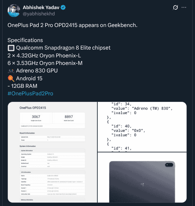 Coming to the Geekbench listing, the OnePlus ‘OPD2415’ tablet (mentioned to be the OnePlus Pad 2 Pro) has achieved 3067 points in the single-core test, whereas in the multi-core test it acquired 8897 points. Performance specs such as the Qualcomm Snapdragon 8 Elite processor (clocked at 4.32 GHz), Adreno 830 GPU, Android 15 OS, and 12GB RAM have also been revealed via the Geekbench listing.