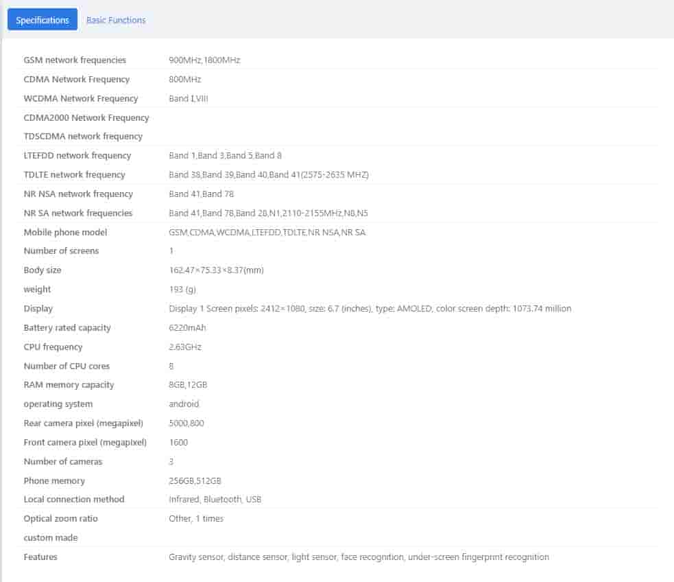 It will sport a 16MP front camera and a 50MP+8MP dual rear camera. The device will include a microSD card slot and an under-screen fingerprint sensor. It measures 162.47×75.33×8.37mm and weighs 193g.