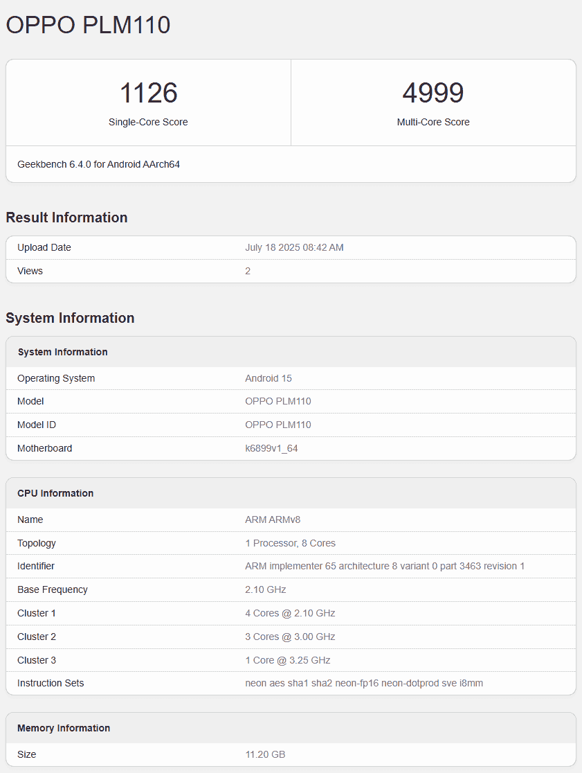 It is said that this is the upcoming Oppo K13 Turbo model. The device has received a 128 single-core score and a 4999 multi-core score. The device runs on Android 15 OS and is tested with a 12GB RAM variant. The database suggests that the smartphone could arrive with MediaTek Dimensity 8450 SoC.