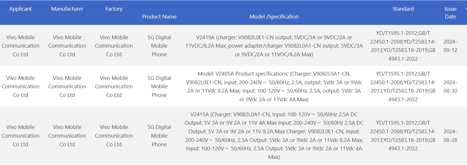 Earlier a Vivo device with model number V2415A was spotted on the 3C certification website and it was assumed that this could be a Vivo X200 smartphone. But a discovery tells a different story. Three upcoming Vivo devices with model numbers V2419A, V2405A, and V2415A have been spotted on the 3C certification website.