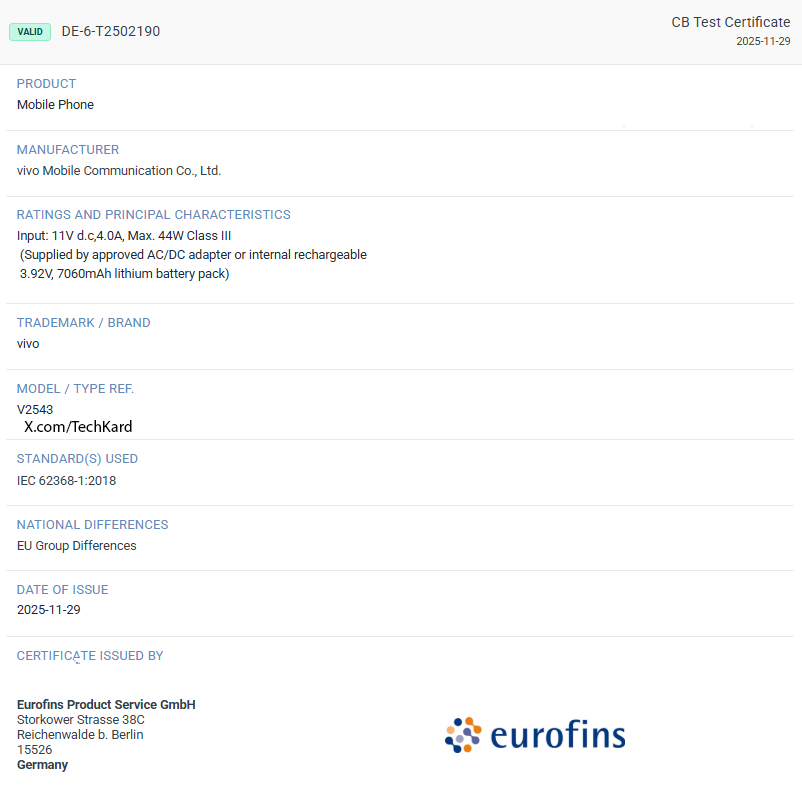 Alleged Vivo Y31d (V2543) Spotted on the Eurofins Certification Database, Revealing 7060 mAh Rated Battery and 44W Wired Fast Charging