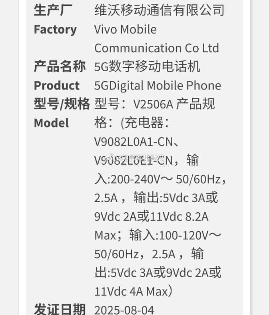 The device is revealed to arrive as a 5G Digital Mobile Phone. The device was listed with charging adapters carrying model numbers V9082L0A1-CN and V9082L0E1-CN, which reveals support for 90W wired fast charging. It is also suggested to be equipped with an 8010mAh battery.