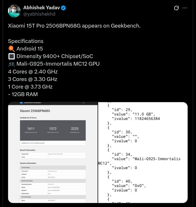 The alleged Xiaomi 15T Pro global variant which carries the model number of ‘2506BPN68G’ has been listed on the Geekbench database, and it has achieved 1611 points, 1572 points, and 2223 points respectively in the single precision, half precision, and quantized tests. Notably, MediaTek’s 3.73 GHz-clocked Dimensity 9400+ chip has been confirmed for the upcoming device as per its listing on Geekbench, and the device is integrated with the ARM Mali-G925-Immortalis MC12 GPU. Android 15 OS and 12GB RAM are its other Geekbench-revealed performance specs. Also to note, it is mentioned with the codename – ‘klimt’ on the database (however this was previously attributed to the Xiaomi 15T).