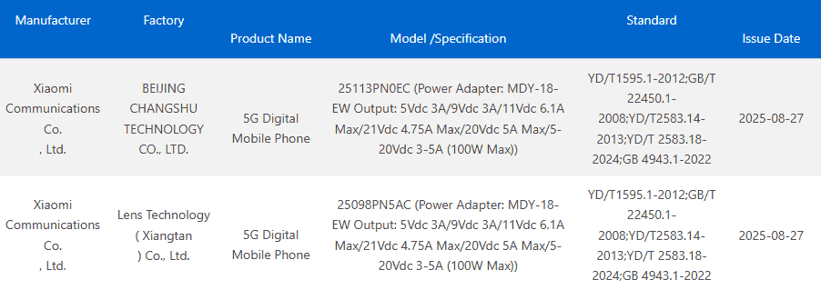 Today, two new Xiaomi devices made their appearance on the 3C certification website with model numbers 25113PN0EC and 25098PN5AC. It is said that these model numbers belong to the Xiaomi 16 smartphone series.