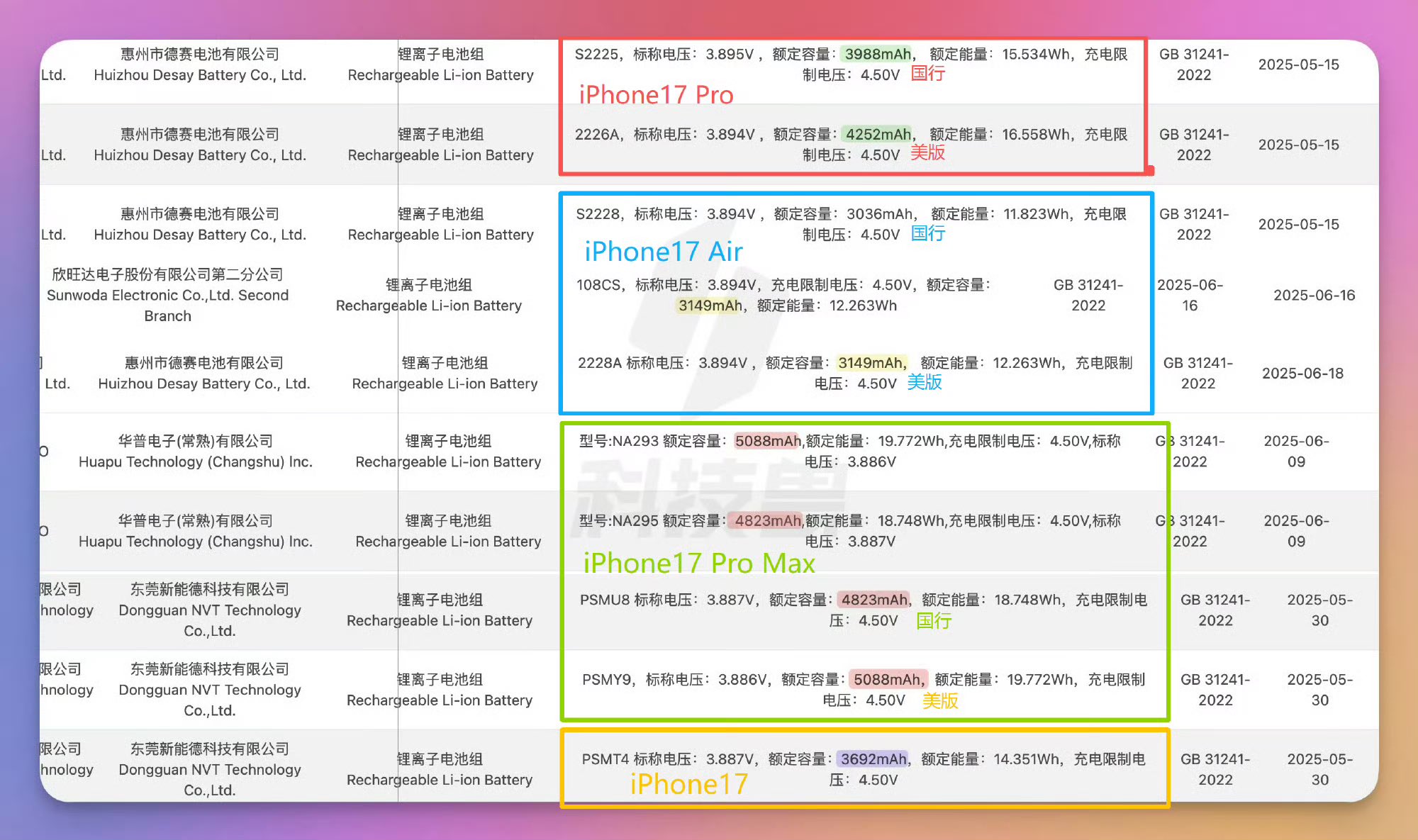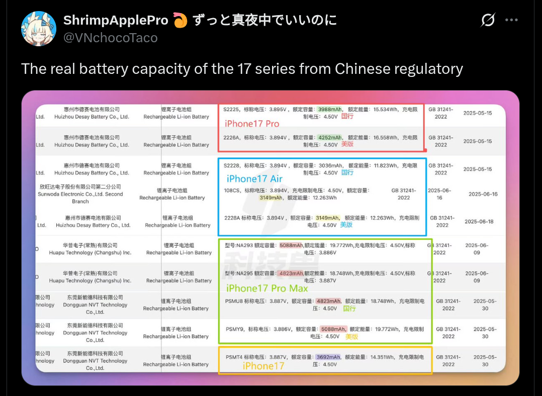 Apple iPhone 17 Series Actual Battery Capacities Revealed Via Chinese Regulatory Platform
