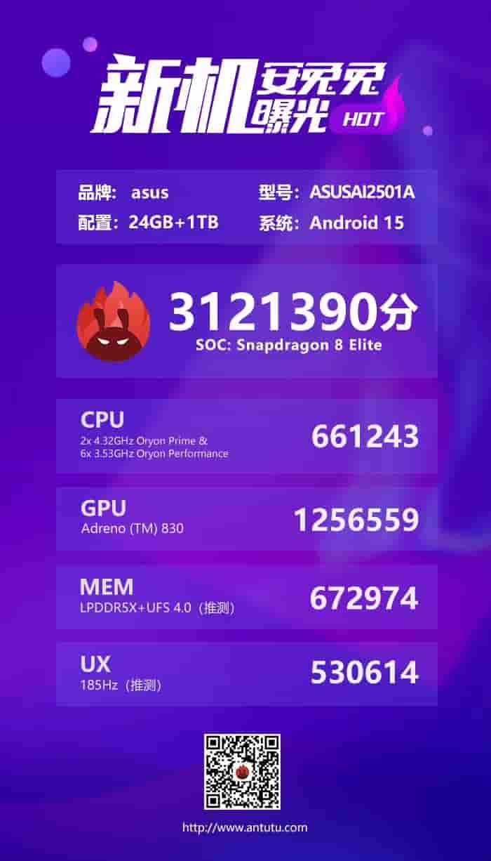 The device was spotted with a Snapdragon 8 Elite SoC and has received a 3121390 AnTuTu score. The chipset is paired with 24GB LPDDR5X RAM and 1TB UFS 4.0 storage. It runs on Android 15 OS and will offer a 185Hz refresh rate. The smartphone has received 661243 points for CPU performance and 1256559 points for GPU performance.