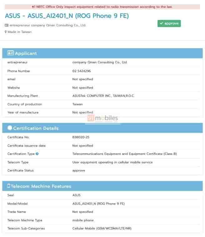 ASUS ROG Phone 9 FE has now been spotted on Malaysia’s SIRIM certification and Thailand’s NBTC database with model number ASUS_AI2401_N.