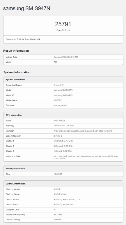 Interestingly, the OpenCL information also highlights a clear difference between the two GPU generations. The Samsung Xclipse 970 listing shows just 4 compute units, a maximum frequency of 555MHz, and 1GB of reported device memory. In comparison, the Samsung Xclipse 960 GPU used in the Exynos 2600 was listed with 8 compute units, a higher 980MHz maximum frequency, and 4GB of device memory. This gap helps explain why the early OpenCL score of 15,618 appears significantly lower than the roughly 25,791 score seen on Exynos 2600-powered Galaxy S devices. That said, since this is still an early listing, performance figures may change as development progresses.