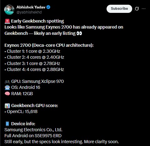 Early Geekbench listing of alleged Exynos 2700 SoC reveals deca-core CPU architecture and Xclipse 970 GPU