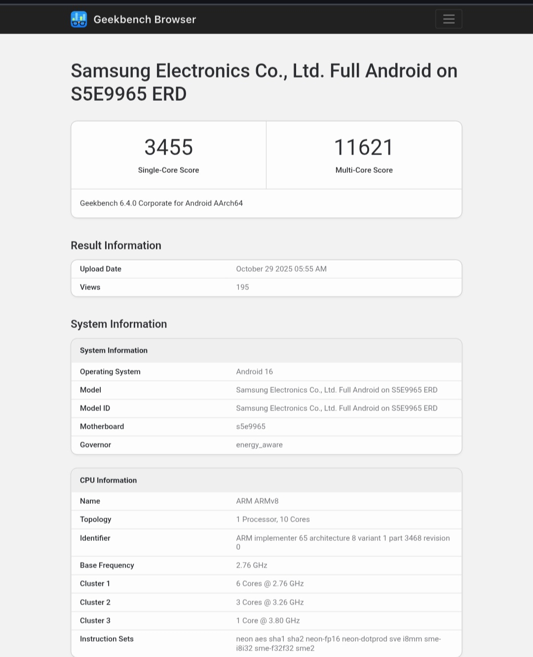 The chipset received a 3455 single-core score and 11621 multi-core score. It is revealed that the upcoming chipset will be paired with the Samsung Xclipse 960 GPU. The listing also shows 12GB RAM and Android 16 OS.