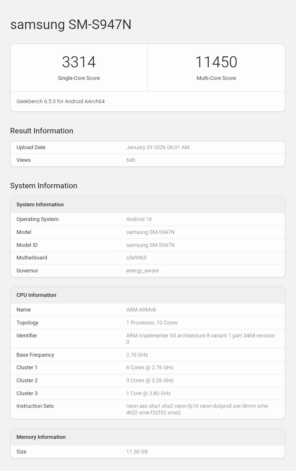 The device has received a 3314 single-core score and a 11450 multi-core score. Other markets are expected to get the Snapdragon 8 Elite Gen 5 SoC. Previously, Galaxy S26+ (SM-S947U) US variant (earlier thought to be the Galaxy S26 Edge) was spotted on the Geekbench database with the Snapdragon chipset. The Snapdragon variant achieved a 3393 single-core score and 11515 multi-core score, slightly more than the Exynos variant.