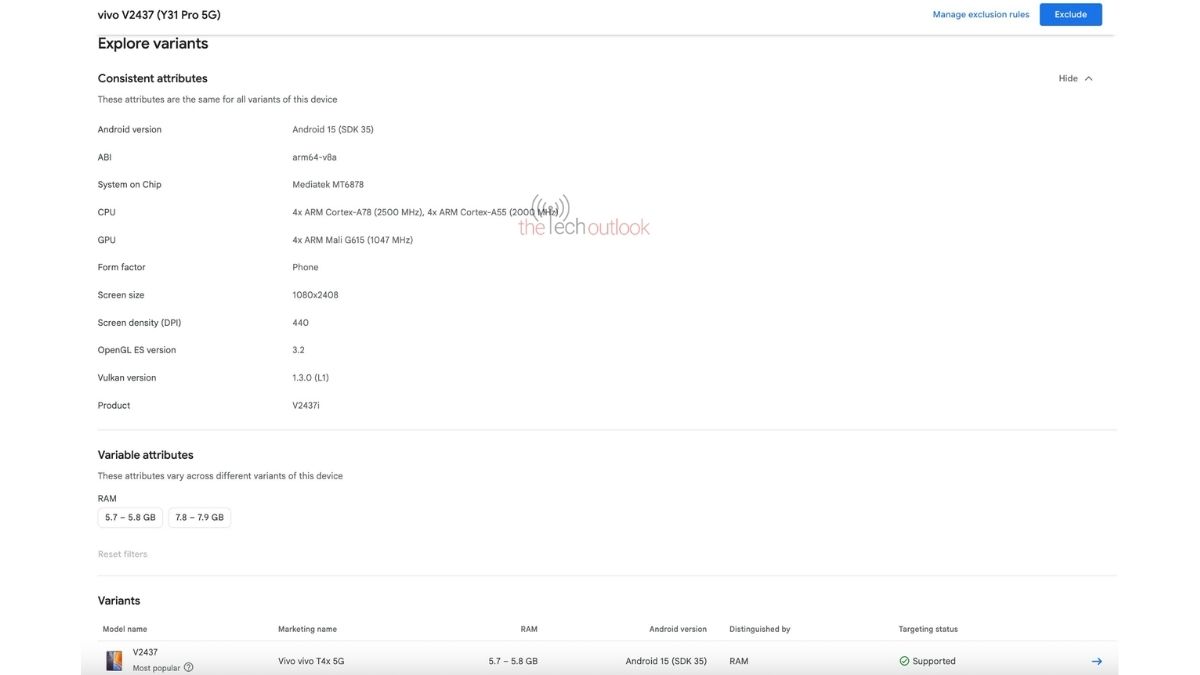 Moving further, in the Google Play Console listing, the moniker is listed as Vivo Y31 Pro 5G with the model number “V2437”. The CPU shows a total of 8 cores with 4 cores clocked at 2.5GHz and the remaining 4 cores clocked at 2.0GHz. The SoC listed in the listing is MediaTek MT6878, which is the MediaTek Dimensity 7300 SoC paired with Mali G615 GPU clocked at 1047 MHz.
