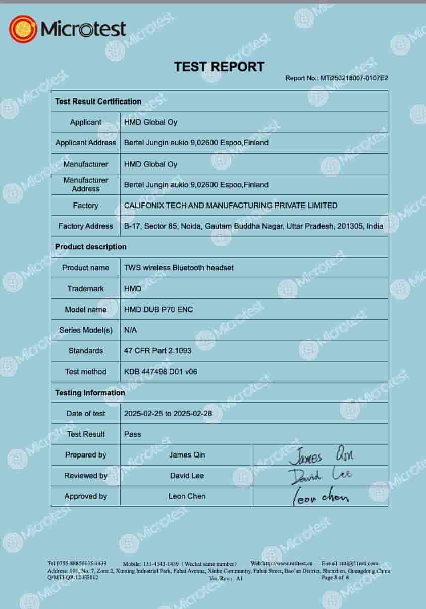 The HMD DUB P70 ENC earbuds device has received the FCC certification and it has been listed on the certification database as a ‘TWS wireless Bluetooth headset’. As per its certification listing, the earbuds will be supporting a Bluetooth connectivity of version 5.3, and each earbuds and the charging case are respectively pointed out to pack 35 mAh and 400 mAh battery backup. Notably, HMD’s DUB P70 ENC will be manufactured in India, at the Califonix Tech and Manufacturing Private Limited, Noida, Uttar Pradesh.