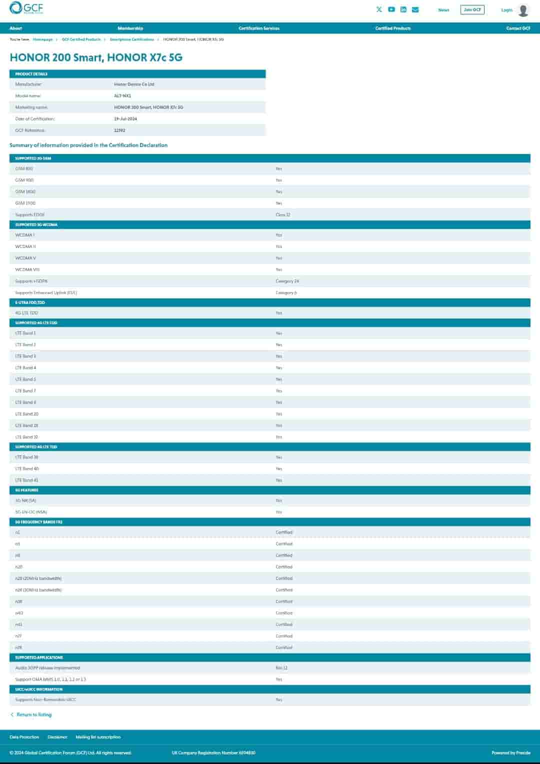 The above database reveals two monikers- Honor 200 Smart and Honor X7c 5G. This suggests that the device might launch with different monikers in different countries. GCF database also revealed that the smartphone will arrive with 5G connectivity with support for 11 bands- n1, n3, n8, n20, n28 (20MHz bandwidth), n28 (30MHz bandwidth), n38, n40, n41, n77 and n78.
